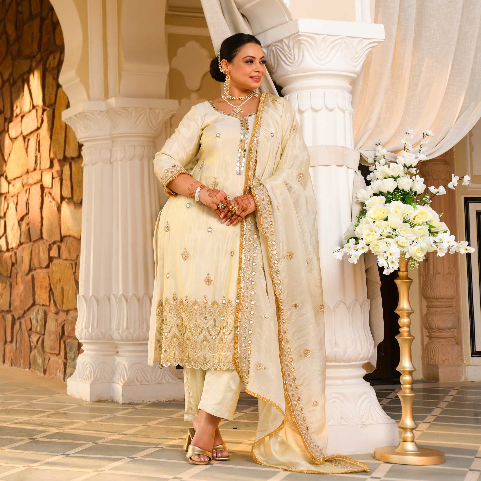 Royal Gold Tissue Suit Set combines style and comfort for everyday wear. Breathable design and cushioned support keep you comfortable all day. Ideal for city walks, errands, and casual outings. Durable construction and versatile style for any occasion.